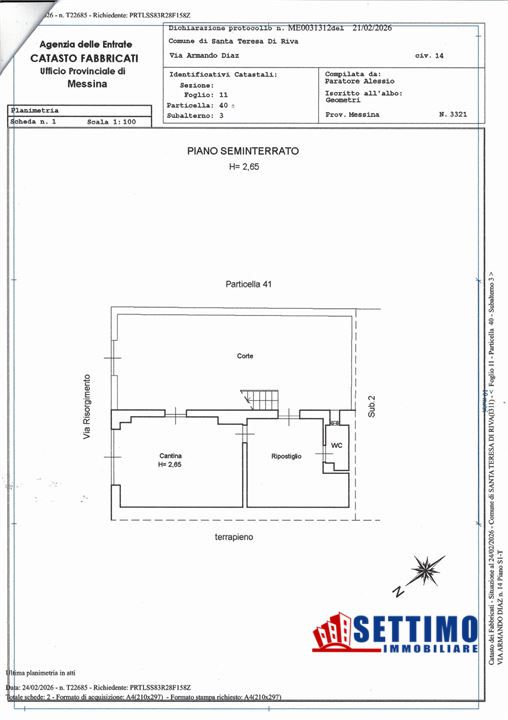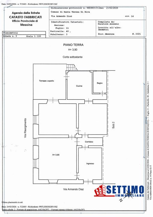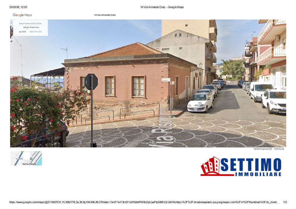 Casa singola sita nel comune di Santa Teresa di Riva, sita in via Armando Daiz. 14, l'immobile si divide su 2 livelli, piani seminterrato, terra e cortile, ha una superficie complessiva di mq 200 circa, posizione panoramica e in prossimità della via Roma, nel centro urbano comoda per raggiungere edificio postale, stazione ferroviaria e piazza municipio.